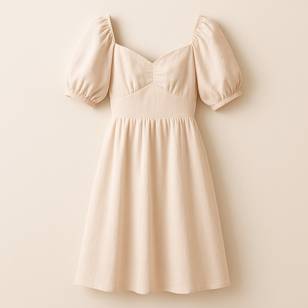 Robe midi fluide, col en cœur, couleur crème rosée. Ultra féminine et chic pour la saison.